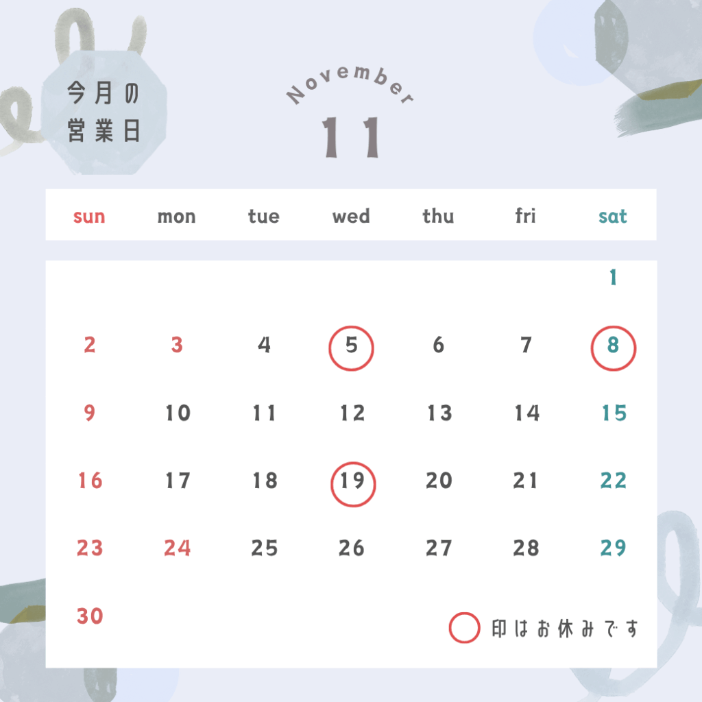 11月は5日(水)、8日(土)、19日(水)をお休みとさせて頂きますので、お間違えの無いようよろしくお願いします🙇‍♀️