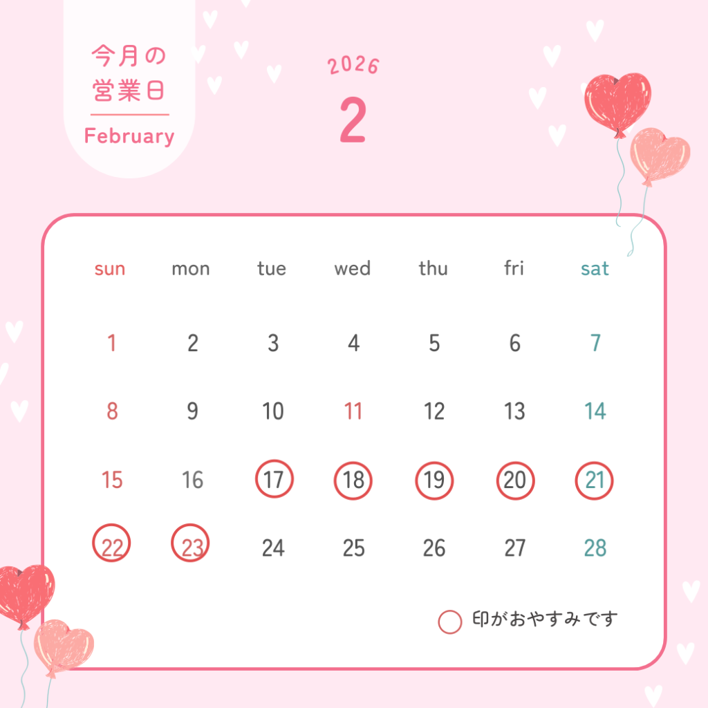 2月のお休みのお知らせ 2026 1/31 2026年1月31日 皆さんこんにちは♪ 粕屋の整体『ねこやなぎ整体院』の秋山です☆ 2月のお休みのお知らせです。2月は17日(火)〜23日(月)の間をお休みとさせて頂きますので、お間違えの無いようよろしくお願いします🙇♀️ 年末年始の営業のお知らせ 関連記事 年末年始の営業のお知らせ 2025年12月28日 12月のお休みのお知らせ 2025年11月30日 11月のお休みのお知らせ 2025年10月31日 10月のお休みのお知らせ 2025年9月30日 9月のお休みのお知らせ 2025年9月1日 8月のお休みのお知らせ 2025年7月31日 7月のお休みのお知らせ 2025年6月28日 6月のお休みのお知らせ 2025年5月31日